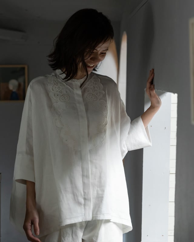 今までKEYCOの付衿で登場したことのある人気のボーラー花刺繍。今シーズンはビブとして少し大きめのアレンジでシャツを彩ります。刺繍は昔から着物の横振り刺繍など様々な刺繍を手掛けてきた群馬県桐生市で1点1点制作。又、シャツ本体には、今回初めて琵琶湖の湖東で丁寧に織られているリネン素材を使用しています。高密度でしっかりとしたリネンは1枚で来ても存在感があり、しなやかなドレープ感が上品な印象です。