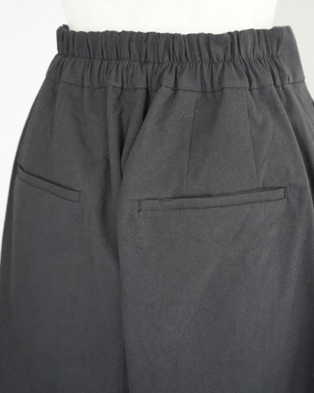 袴の様にボリューム感があり足首が見える涼し気な丈感のワイドパンツ。絞ったウェストと裾に向けて広がるボリューム感がメリハリのあるシルエットを作ってくれます。ウェストの後ろはゴム仕様ですが、ウェストベルトに幅があるのでカジュアルな印象を与えません。生地にはしっかりと厚みのある遠州織物を使用。和紙のような表情のある素材感も魅力です。暖かい時期にはレースアップのシューズなど足元のお洒落も引き立ててくれるボトムスです。