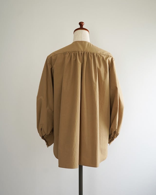 春夏にホワイトとブラックで登場したオリジナル刺繍を使用したビブが特徴のパフスリーブシャツ。今回は落ち着いたベージュ色展開となります。刺繍パーツには振袖やスカジャンなどの横降り刺繍などを手掛けてきた群馬県桐生市で1点1点制作。又、シャツ本体には適度なハリ感と手もみで染料を揉み込むことで出来る小さな凸凹が特徴の高密度ブロードを使用しています。肌離れが良くサラリとした質感が人気の素材です。刺繍とパフスリーブで一見フェミニンな印象ですが、メンズライクなパンツやフラットシューズと合わせシャープな着こなしもお薦めです。