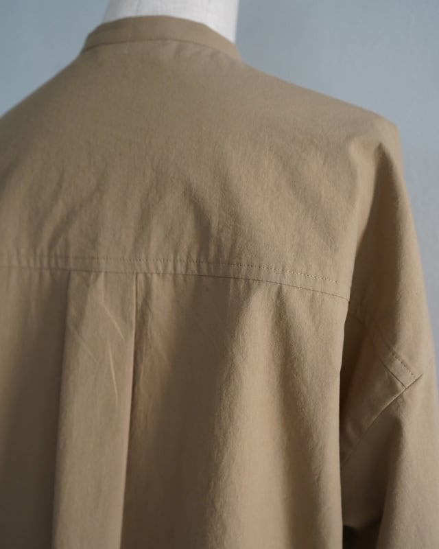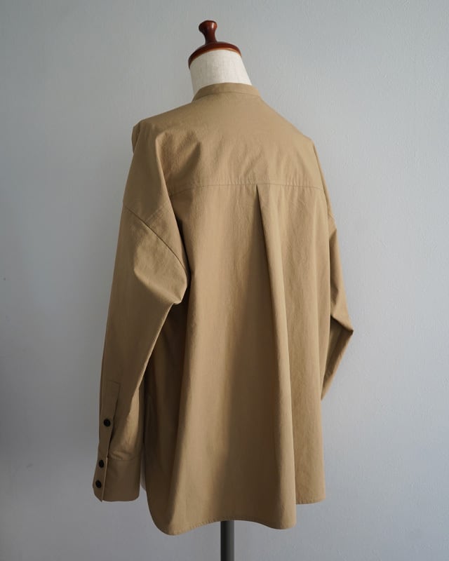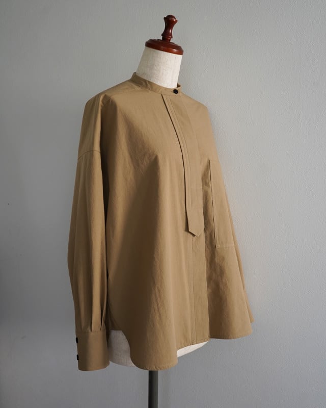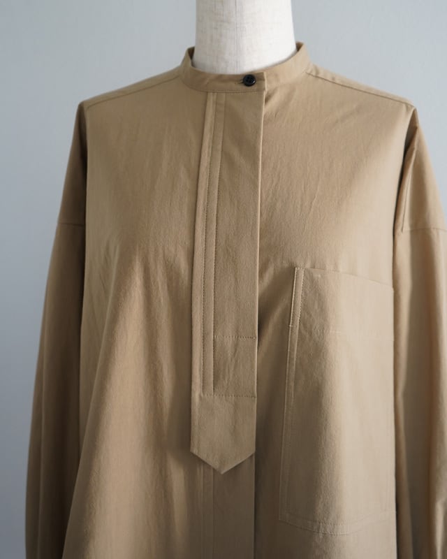 KEYCOのアイコンの一つであるビブヨークを最大限小さくしたデザインとブラックボタンが印象的なシャツ。今回はウール素材の他、サラリとしたコットン素材でも展開します。ベージュ生地と黒ボタンのコントラスト、そして大き目の胸ポケットがマニッシュな印象の商品となります。1枚でも、タートルニット等との重ね着でもお楽しみ頂ける様商品です。