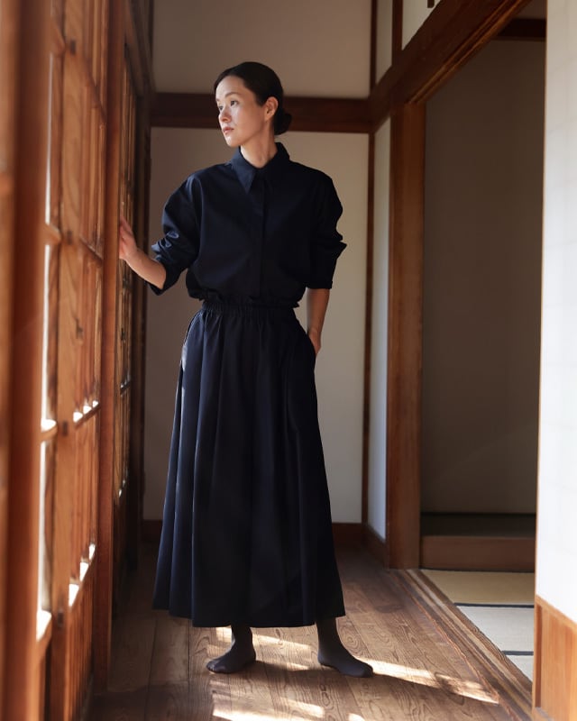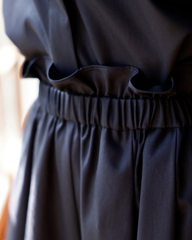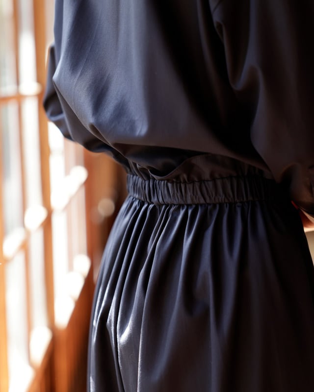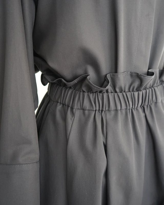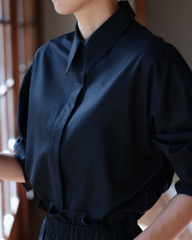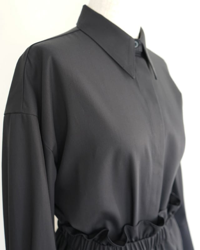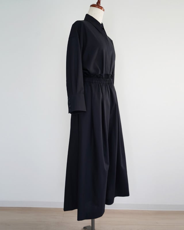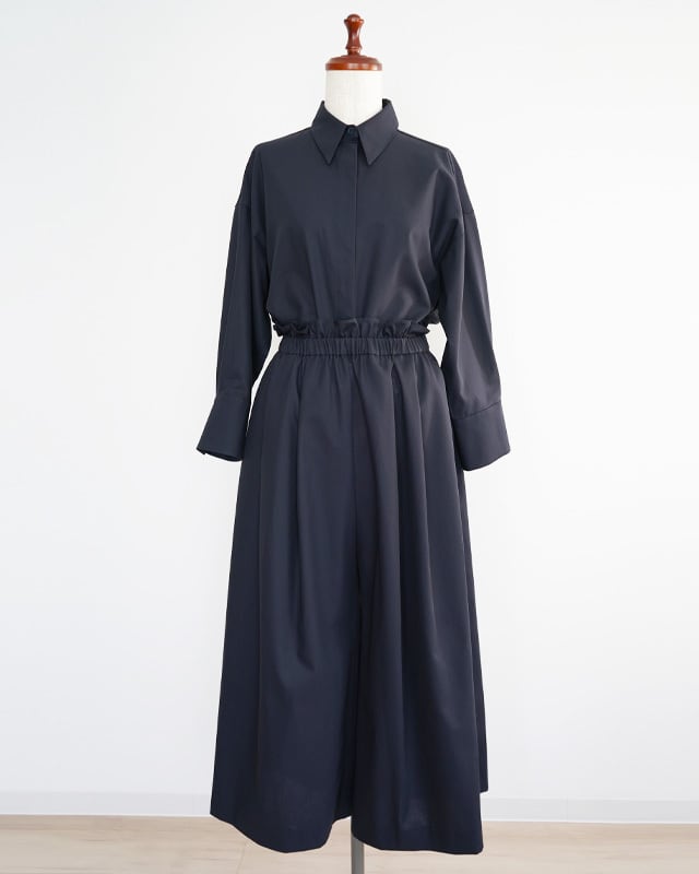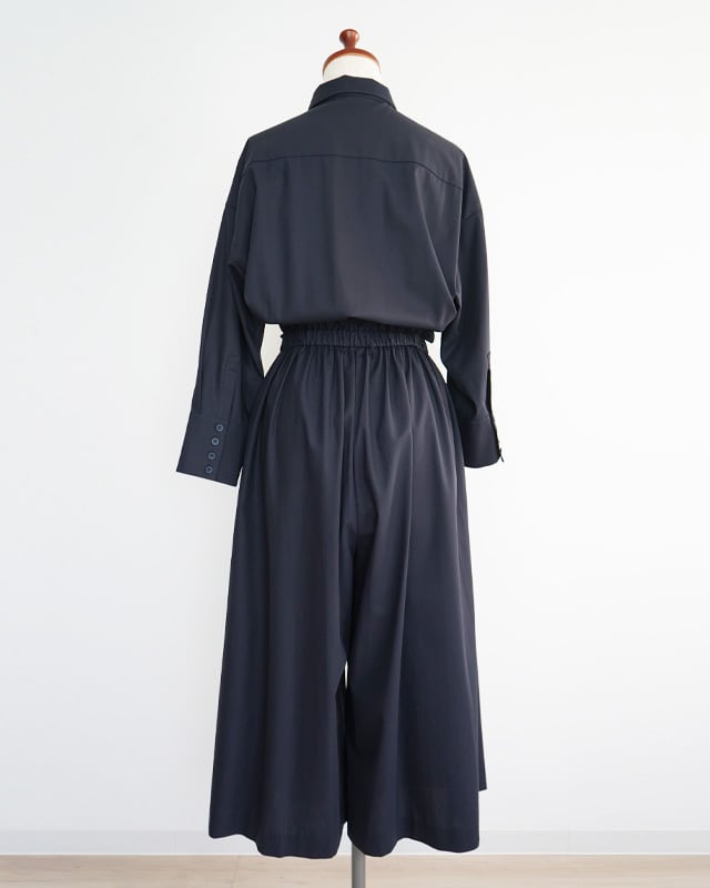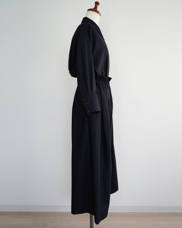シャープな襟が特徴のジャンプスーツ。微光沢のある強撚生地を使用し、クリーンなシルエットの衿とカフスで仕上げる事でメンズっぽさもありながらエレガントな印象も与える商品となりました。襟が付いているので上釦をはずしてネックレスをのぞかせたり、タートルをインナーに重ねて頂くなど様々なスタイリングでお楽しみ頂けます。お出かけやイベント事、お仕事などでも1枚で決まるアイテムです。