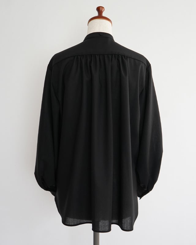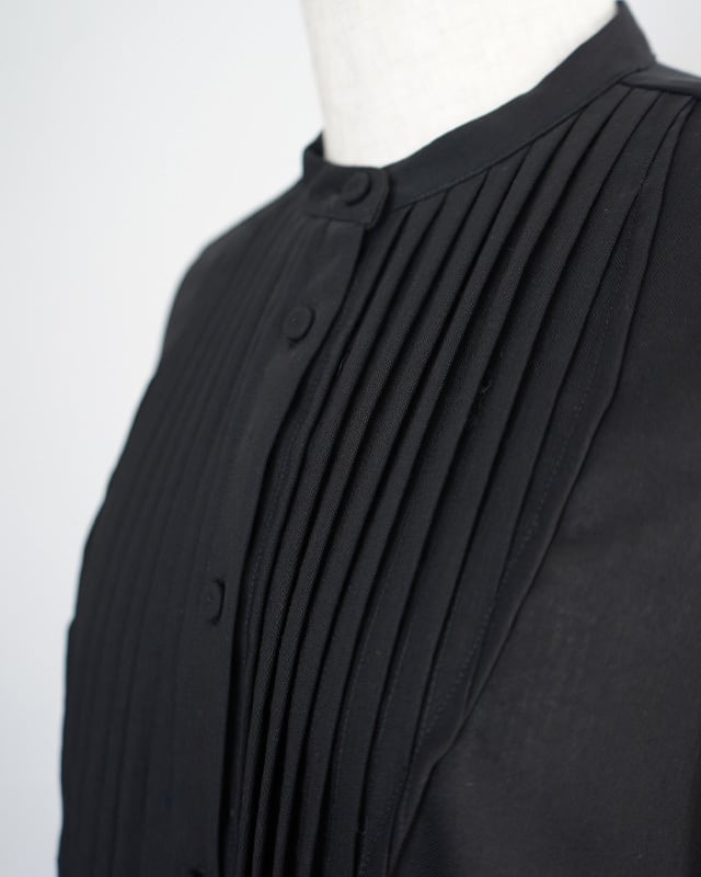 プリーツのビブが美しいパフスリーブシャツ。釦にはフラットのくるみ釦を使用している為全体的にマットで落ち着いた雰囲気。上品なイメージですが、フラットシューズやメンズライクなパンツとの組み合わせでマニッシュなスタイリングがお勧めです。