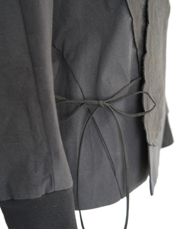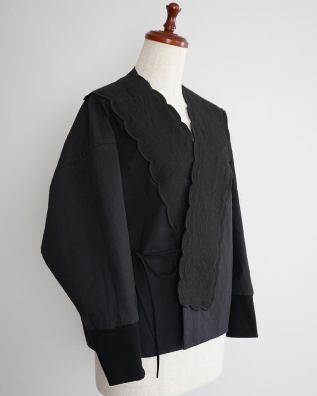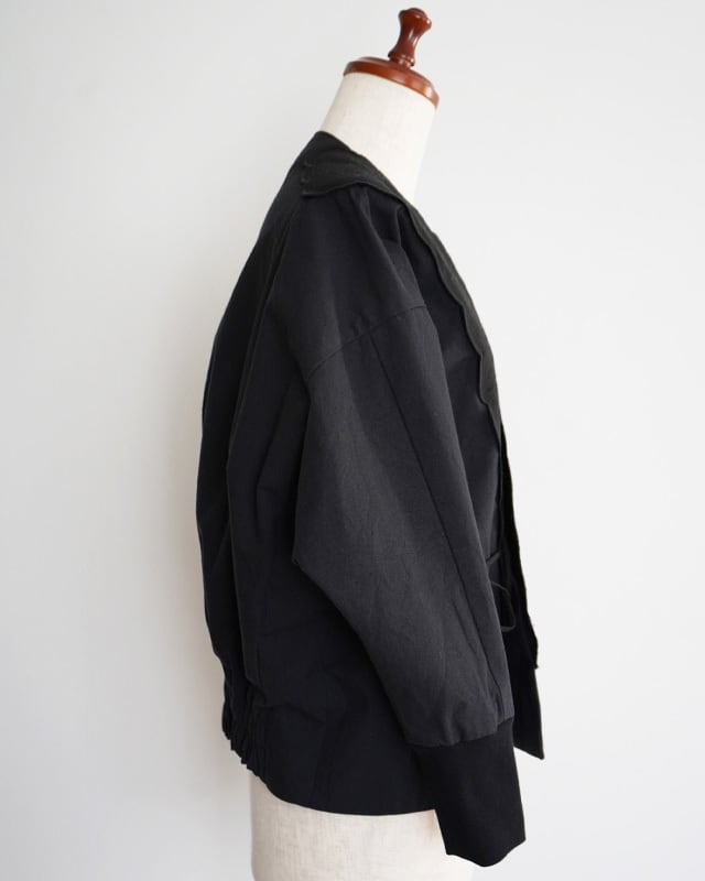 春に登場した刺繍ジレのブルゾンバージョン。昔から振袖やスカジャンなどヨコぶり刺繍等を手掛ける群馬県桐生市の工房で1点1点機械刺繍を施している刺繍パーツ。この刺繍パーツと静岡県の遠州地方で織っている高密度の綿織物を組み合わせたブルゾンは唯一無二。袖はドルマンスリーブの為でとても動きやすい構造で袖元のリブをたくし上げると腕回りにボリュームが出てカッコいい雰囲気になります。