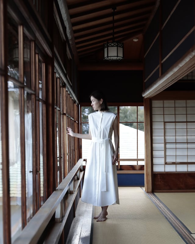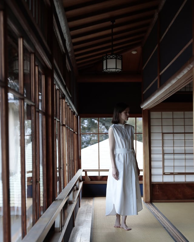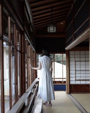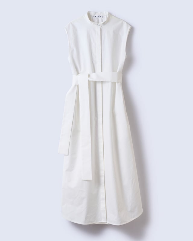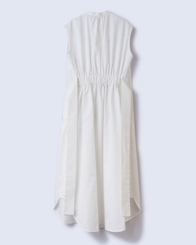 ウィングカラーのノースリーブワンピース。KEYCOでお馴染みのウェストバッグギャザーとベルトが特徴。ノースリーブですが、やや広めの肩幅で肩を覆ってくれる為、日常的にも取り言えれやすい1枚です。1枚でワンピースとしてはもちろんですが、背の高い方はワイドパンツ等と合わせても素敵です。ホワイトは、遠州産地でシャトル織機を使用しゆっくり時間をかけて織りあげているタイプライター。低速織機で織る事でしっかりと目がつまった生地になると同時にふっくらとした風合いに。ハリ感がありながらも肌への馴染のよい生地です。