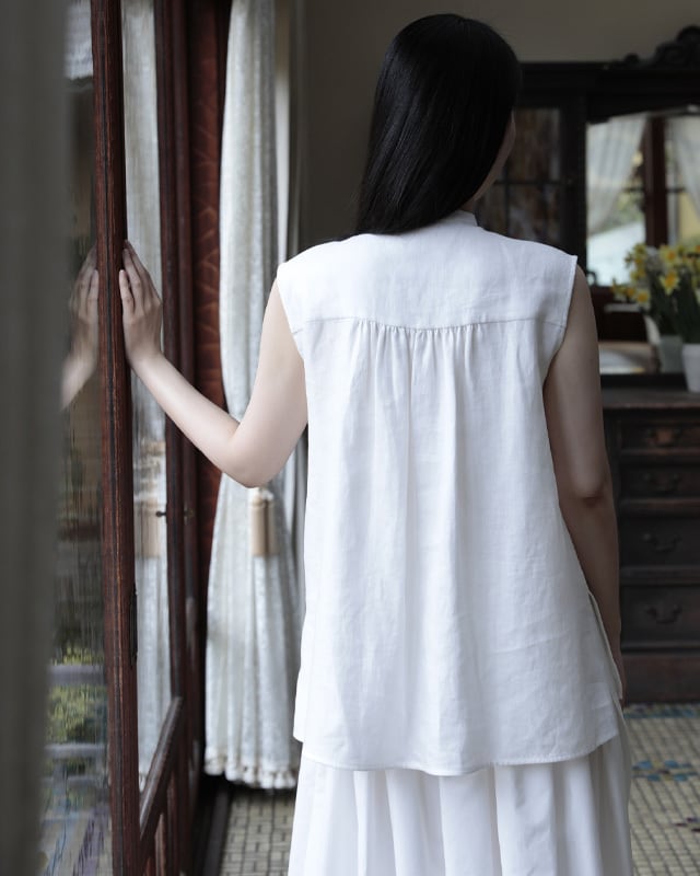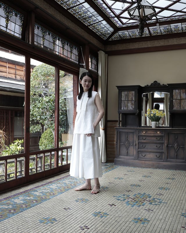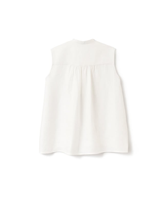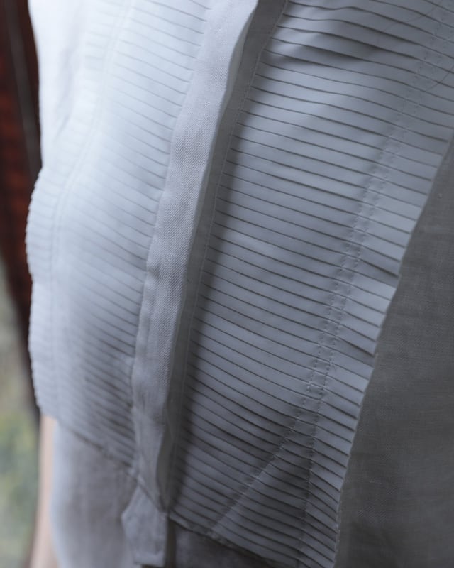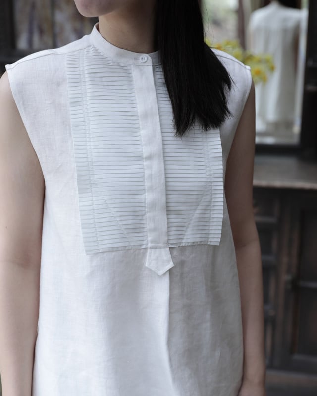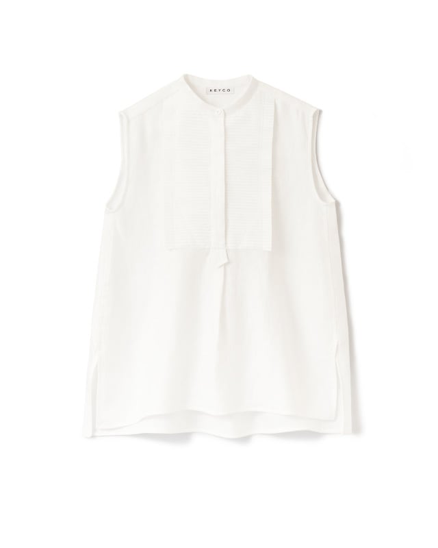 ビブにプリーツをあしらったノースリーブシャツ。プリーツのパーツを岐阜のプリーツ工房で1パーツずつオリジナルで作り仕立てています。高密度な生地にピアノの鍵盤の様にシンプルで真っすぐなプリーツを施しているので、可愛らしさよりもKEYCOらしくシャープな印象に仕上がりました。ボディには、昨シーズンから仲間入りした滋賀県で織りあげられている上質なリネンを使用。綾織なので微光沢が美しく滑らかな素材感、そしてしっかりした織なので1枚でも存在感のあります。