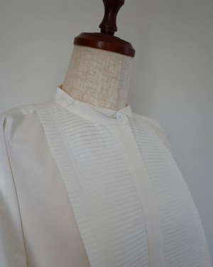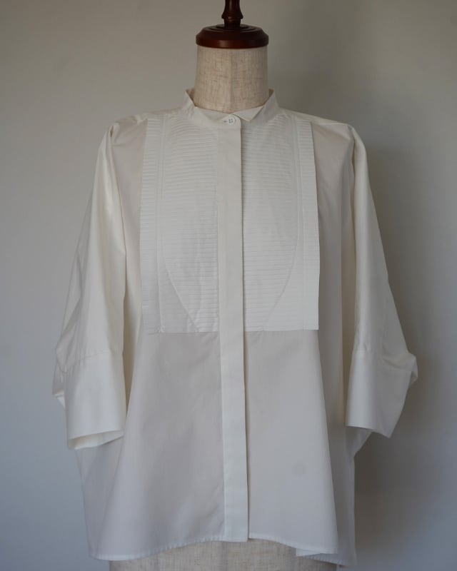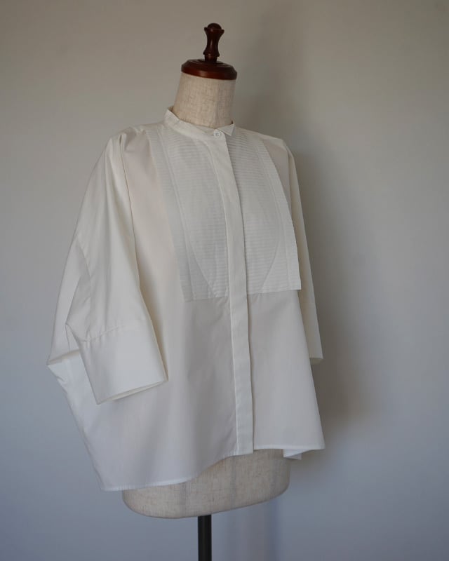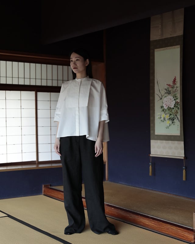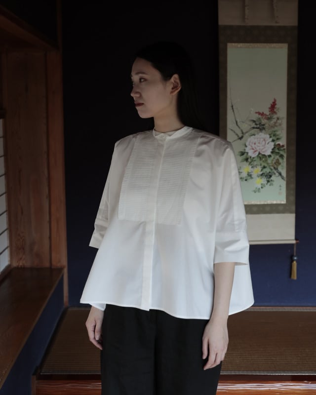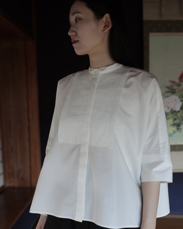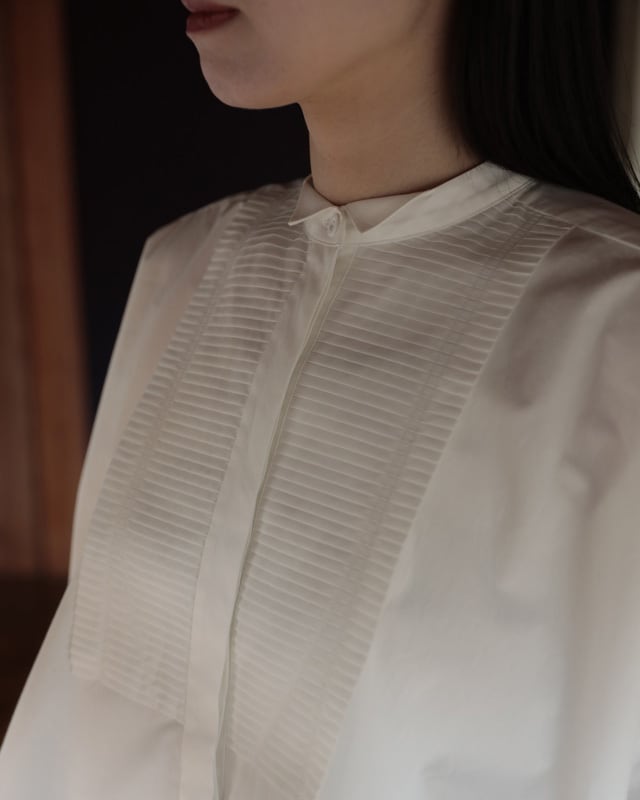 #CAROLINAと同じビブプリーツをあしらったスクエアシャツ。広げると長方形に見えるシャツですが、着た時のシルエットが美しく見える様に実は数ミリ単位でのパターン調整をしています。ビブのプリーツ部分は1枚1枚オリジナルでプリーツ加工を施し、端をレーザーでカット。レーザーカットする事で軽やかでシャープな印象に仕上がっています。プリーツに入れているステッチはビブの形から。また、衿元はウィングカラーになっていてマニッシュさと女性らしさを同時に感じられる1着です。