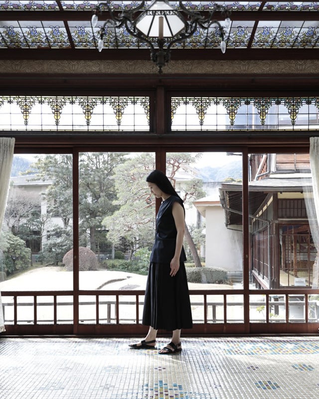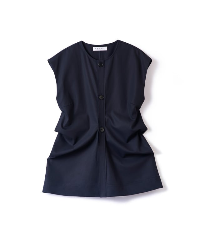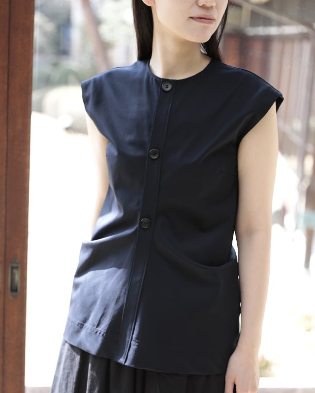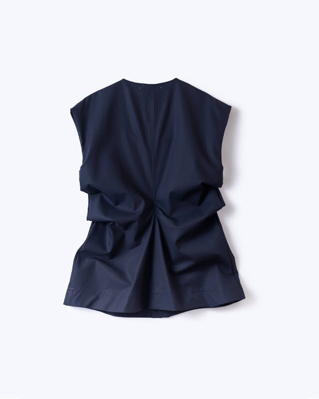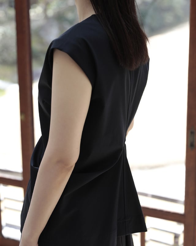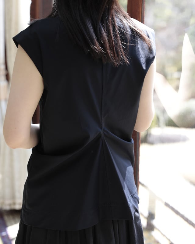 ドレープが美しいノースリーブブラウス。計算されパターンに落とし込まれたデザインは、人の体が纏って初めて表情を表します。一見シンプルでいて着ると存在感のあるアイテム。やや広めの肩幅はマニッシュな印象。ボリューム感のあるギャザースカートやワイドパンツのも相性が◎しなやかで流れるような美しさが特徴の綿ボイルの生地がシルエットを美しく表現しています。