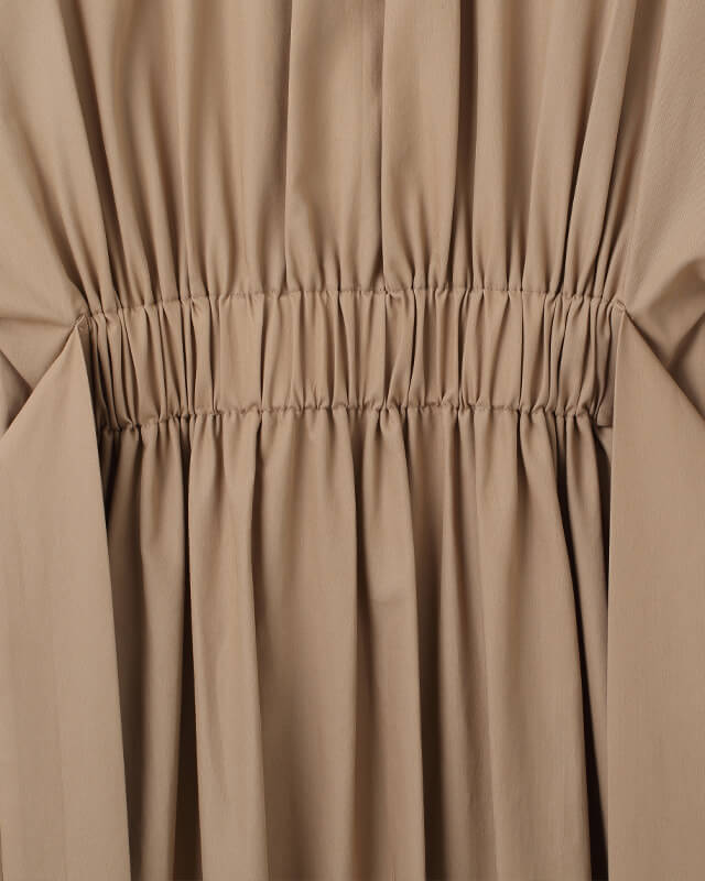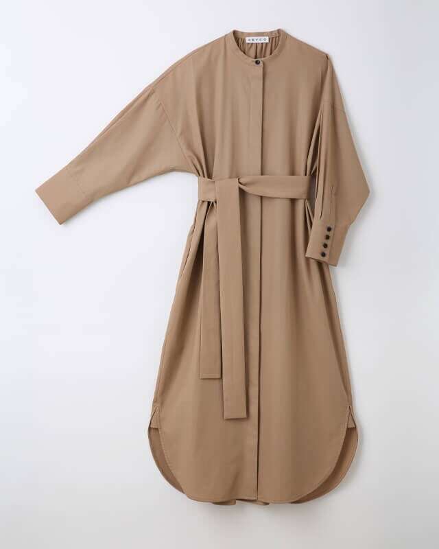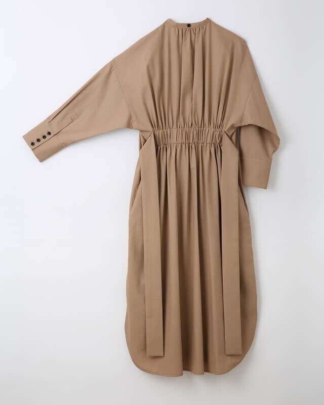 強撚糸で織り上げた素材を使用した長袖シャツワンピース。とろみ感としなやかさ、微光沢を併せ持った生地で綿100%とは思えない肌触りが印象的。前を開ければロングカーディガンとして、前を閉じればワンピースとしていろいろなシーンや季節で楽しめる商品です。又、腰のリボンは垂らしてカジュアルに着たり、ウェストで縛ってエレガントにスタイリングする事で印象が大きく変わります。袖まくりすると腕回りにボリュームができカッコいい印象に。